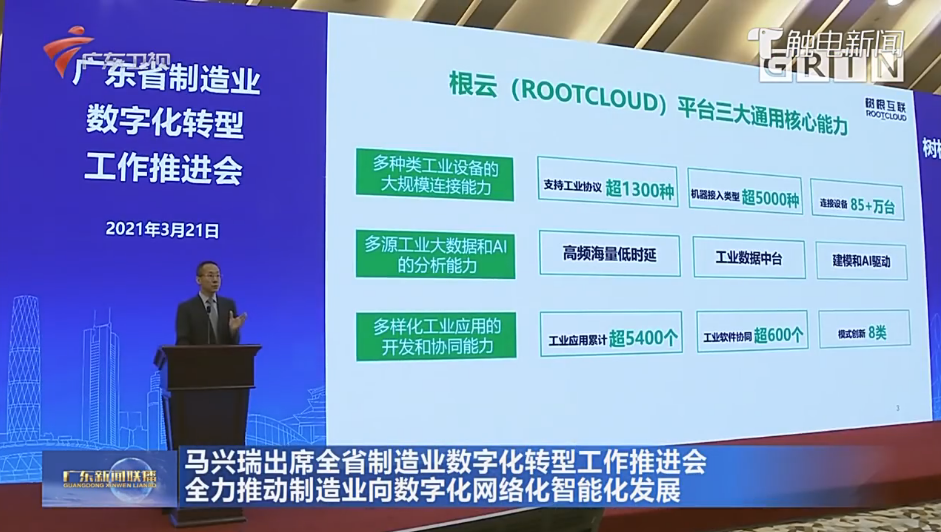 會上,作為國家級跨行業跨領域工業互聯網平臺企業代表,樹根科技聯合創始人、CEO賀東東展示了樹根科技在專注打造工業操作系統上取得的成績,重點介紹了根云(ROOTCLOUD)平臺三大通用核心能力,即多種類工業設備的大規模連接能力、多源工業大數據和AI的分析能力、多樣化工業應用的開發和協同能力,打造跨行業跨領域工業互聯網應用。