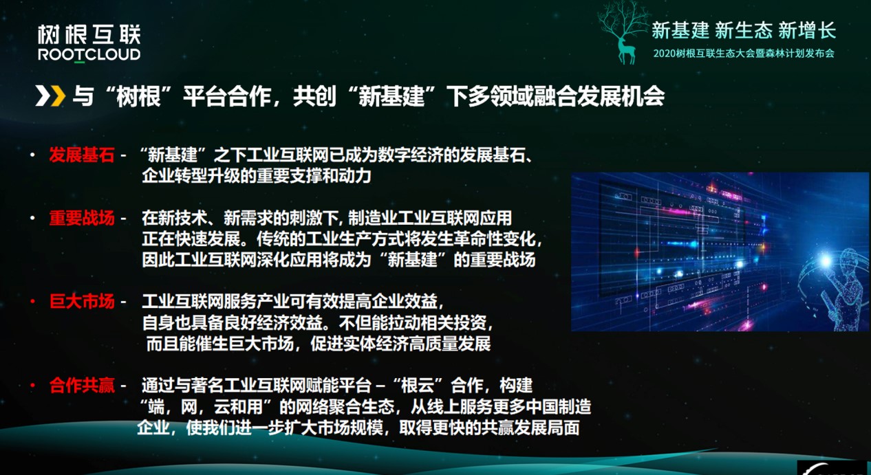 在蔣凱文看來,攜手樹根科技共建工業互聯網生態,尤其是在最近強調的“新基建”情況下,可以在多個領域得到融合發展機會。工業互聯網之下,整個工業深化應用將成為“新基建”重要戰場,給社會效益、企業效益、經濟效益都帶來高質量發展動能。“所以合作共贏是一個最好的結果,我們通過與‘根云’的合作,構建了‘根、網、云、用’的網絡聚合生態,必將擁有巨大市場發展空間。”