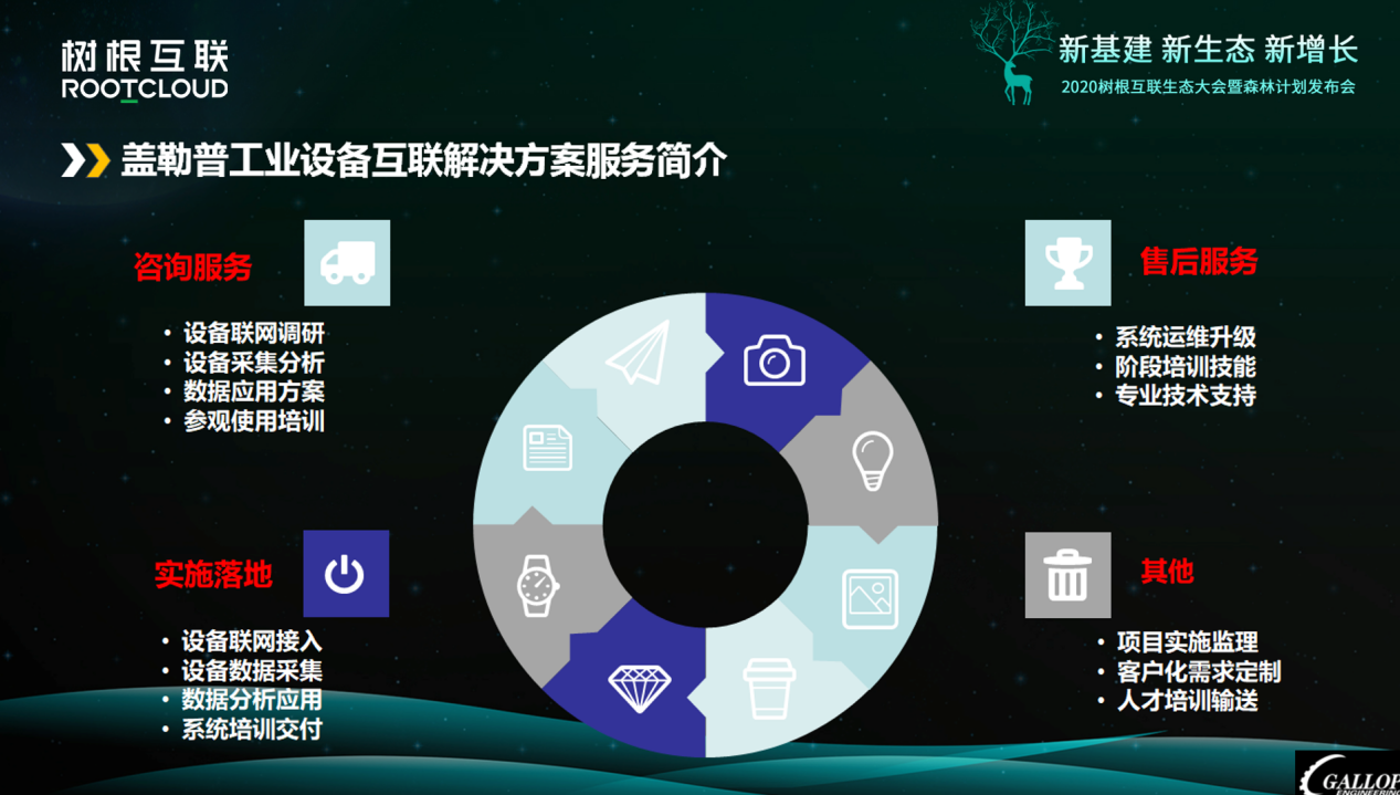 蓋勒普的專業服務,涉及到從項目解決方案、技術的咨詢服務、項目實施的落地服務和售后專業咨詢的培訓,包括項目實施的跟進、客戶專業化的定制和開發、人才技術培訓,售后技術升級等一個廣泛的綜合服務。其工業設備聯網解決方案價值體現在,提供設備網絡化、設備管理平臺化、用數據支撐企業提高設備綜合效率、服務精益管理(關鍵目標)、輔助企業管理快速決策。