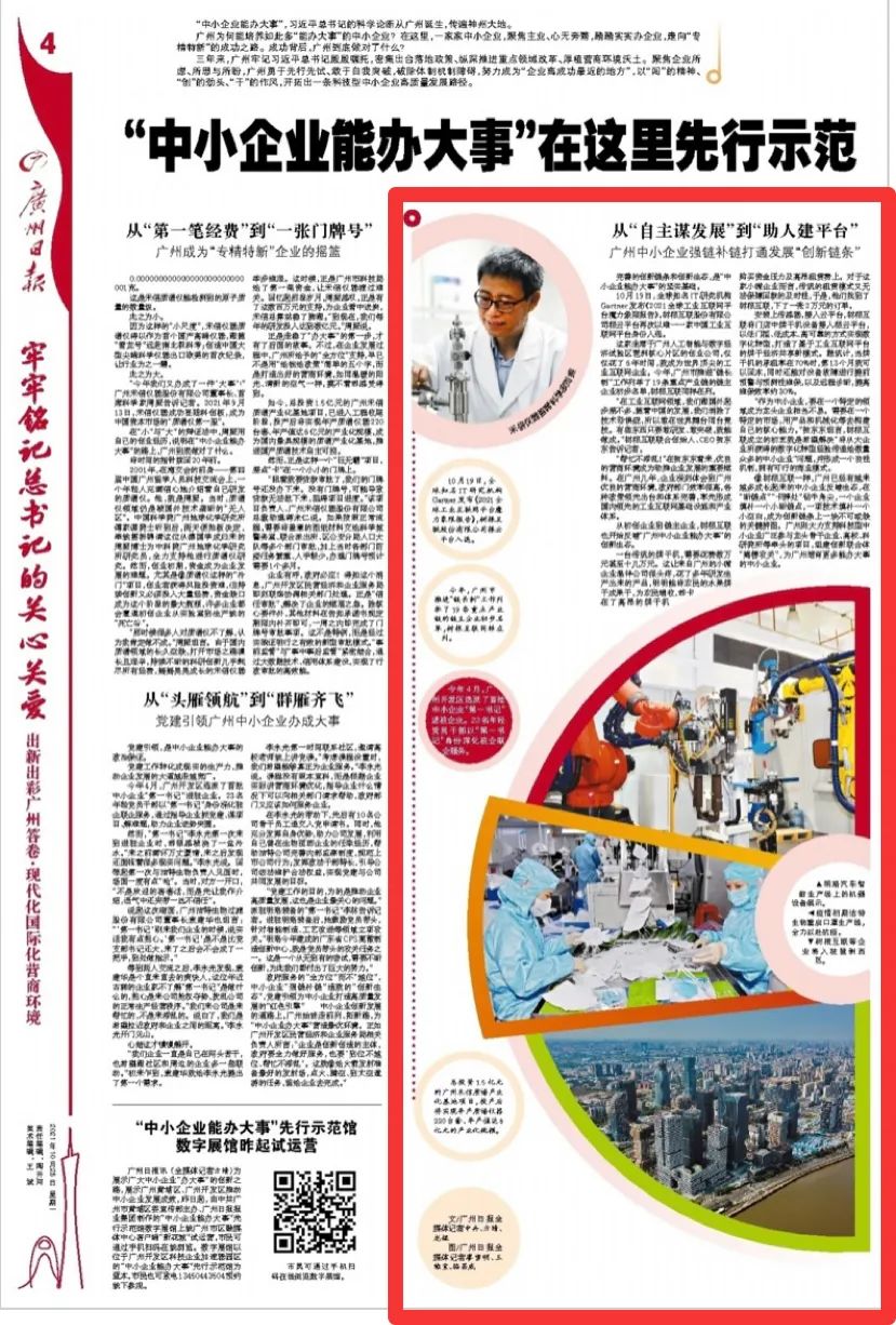 10月25日,《廣州日報》刊發《出新出彩 廣州答卷|“中小企業能辦大事”在這里先行示范》一文,聚焦樹根科技“數字化轉型新基座”應用案例,講述中小企業“乘云而上”的故事。