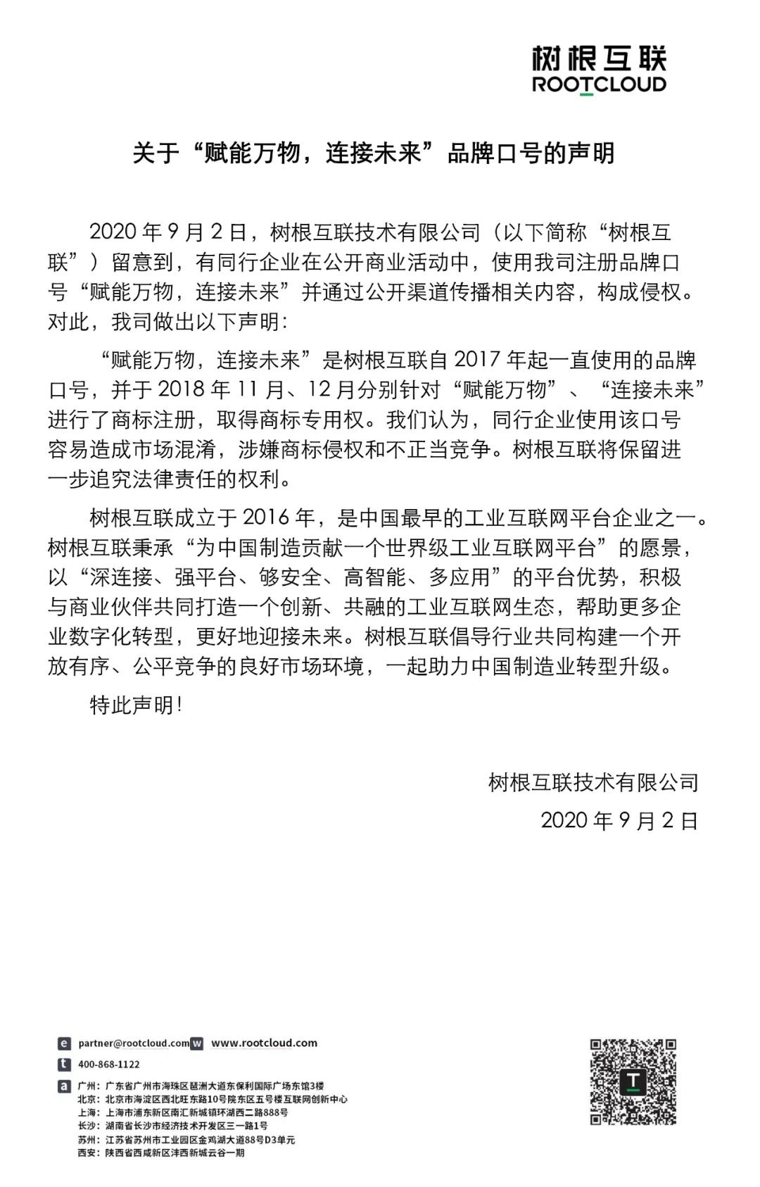 近日,樹根科技技術(shù)有限公司(以下簡稱“樹根科技”)留意到,有同行企業(yè)在公開商業(yè)活動中,使用我司注冊品牌口號“賦能萬物,連接未來”并通過公開渠道傳播相關(guān)內(nèi)容,構(gòu)成侵權(quán)。對此,我司做出以下聲明——