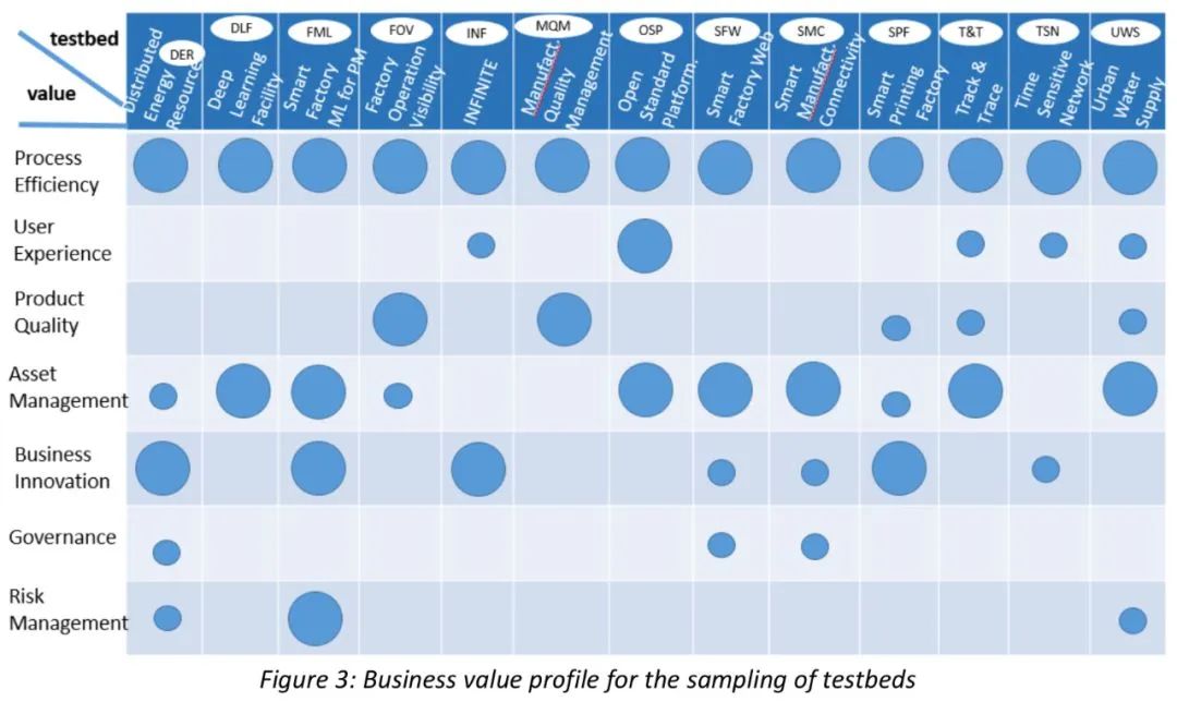 IIC白皮書中匯總了各個測試床的預期業務價值,涵蓋主要價值(大圓點)和次要價值(中圓點和小圓點)。