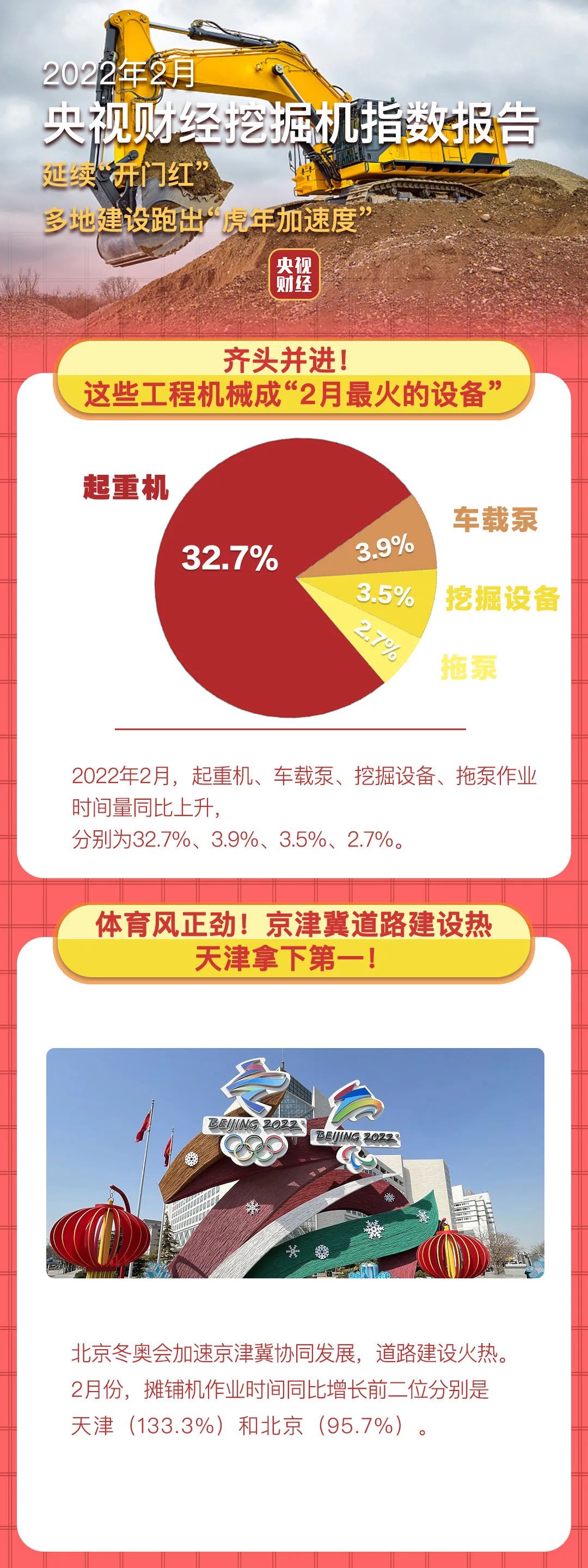 北京冬奧會加速京津冀協同發展,道路建設火熱。央視財經挖掘機指數顯示,2月份攤鋪機作業時間同比增長前兩位分別是天津(133.3%)和北京(95.7%)。