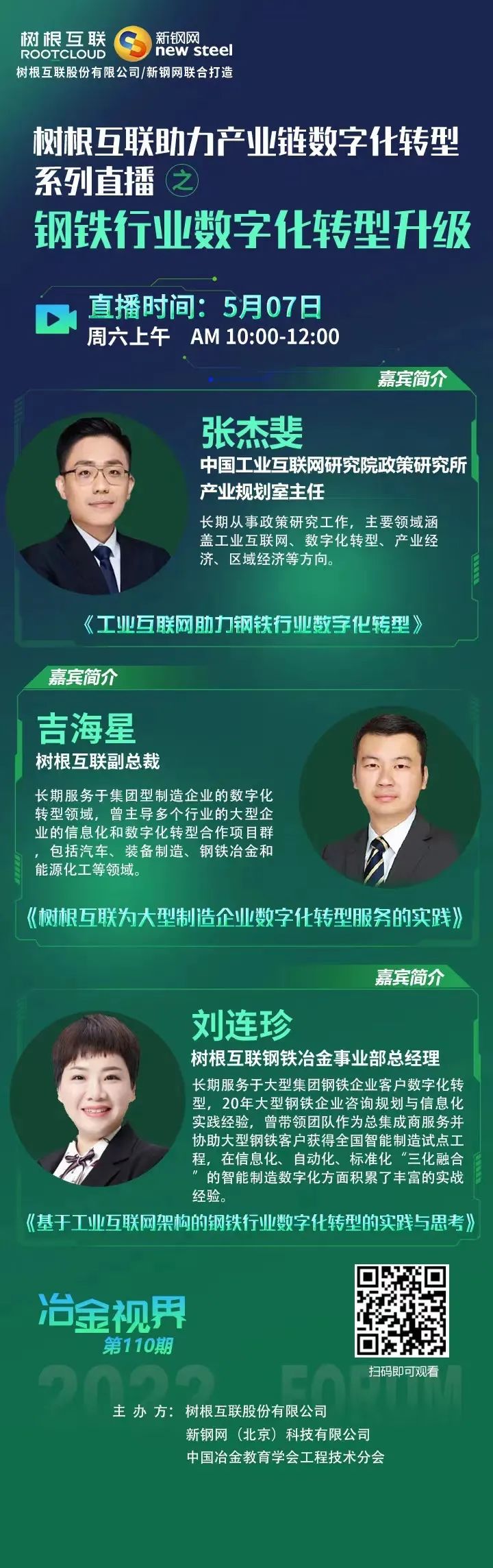 2022年5月7日,在廣州市“鏈長制”辦公室(廣州市工業和信息化局)的指導下,樹根科技作為廣州市“軟件和信創”產業鏈“鏈主”企業,聯合新鋼網舉辦樹根科技助力產業鏈數字化轉型系列直播之“鋼鐵行業數字化轉型升級”活動,特邀數字化轉型專家們帶來鋼鐵行業的專業分享,歡迎各位關注參與本次線上直播活動。
