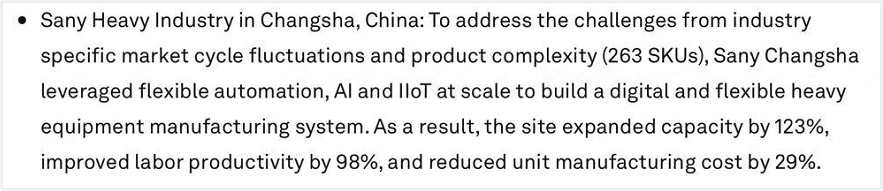 世界經濟論壇官網上這樣介紹三一18號工廠的入選理由:“為應對重工行業市場的周期性波動、多品種小批量及重型部件生產挑戰,三一充分利用柔性自動化生產、人工智能和規模化的IIoT,建立數字化柔性的重型設備制造系統。最終實現工廠產能擴大123%,生產率提高98%,單位制造成本降低29%”。