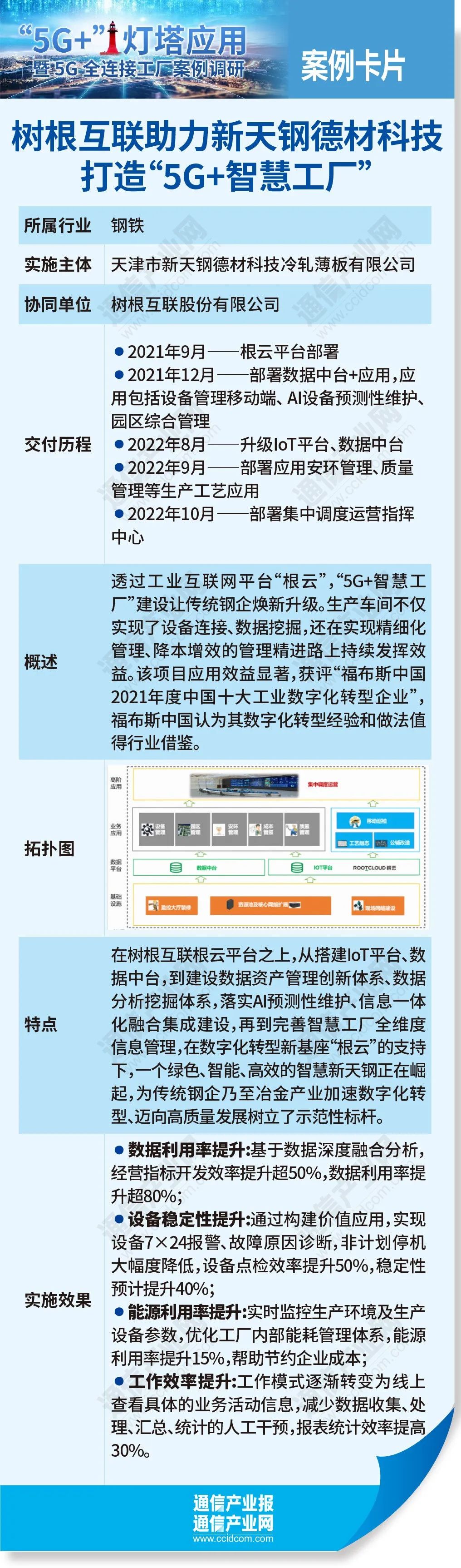 天津市新天鋼德材科技冷軋薄板有限公司副總經理王耀東在接受《通信產業報》全媒體記者采訪時表示,基于5G全連接,新天鋼德材科技冷軋薄板公司需要建設智慧園區項目,我們攜手樹根科技合作“5G+智慧工廠”項目,聯合組建“5G+智慧工廠”工作室。透過工業互聯網平臺“根云”,“5G+智慧工廠”建設讓傳統鋼企煥新升級。生產車間不僅實現了設備連接、數據挖掘,還在實現精細化管理、降本增效的管理精進路上持續發揮效益。該項目應用效益顯著,獲評“福布斯中國2021年度中國十大工業數字化轉型企業”,福布斯中國認為其數字化轉型經驗和做法值得行業借鑒。