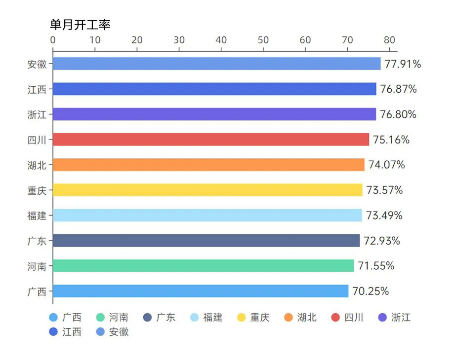 2月份,31個(gè)省份單月開工率超過去年同期水平,22個(gè)省份單月開工率超過60%,10個(gè)省份單月開工率更是超過70%。