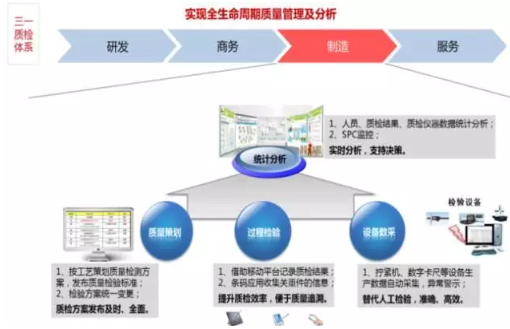 18號(hào)智能工廠通過(guò)GSP、MES、CSM及QIS的整合應(yīng)用,實(shí)現(xiàn)了涵蓋供應(yīng)商送貨、零件制造、整機(jī)裝配、售后服務(wù)等全生命周期的質(zhì)檢數(shù)字化,以及SPC分析、質(zhì)量追溯等功能。