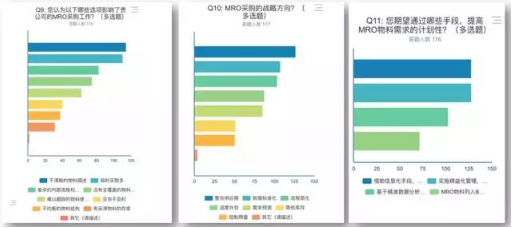 在MRO采購戰(zhàn)略方向調(diào)研中,絕大多數(shù)用戶選擇了,整合供應(yīng)商(71%),數(shù)據(jù)標(biāo)準(zhǔn)化(60%),流程簡化(58%),適度外包(49%)四個選項。可以看出,用戶期望周邊供應(yīng)商供貨能力和內(nèi)部采供流程、物料信息的標(biāo)準(zhǔn)化需求是非常強烈的,同時期望適當(dāng)?shù)耐獍軠p少采購壓力。